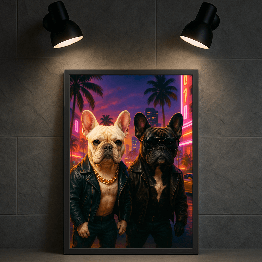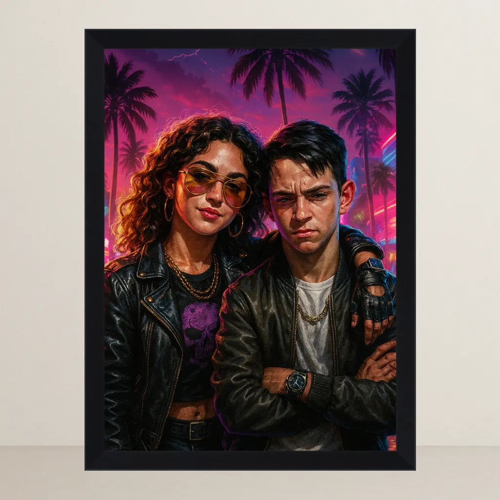 Immagina il tuo amico pelosetto (o il tuo volto) catapultato in un videogioco d’azione esplosivo: tra neon abbaglianti, palmizi tropicali e musica synth, prende vita Bad Boy, uno stile illustrativo che trasforma ogni soggetto in un’icona ribelle da copertina.