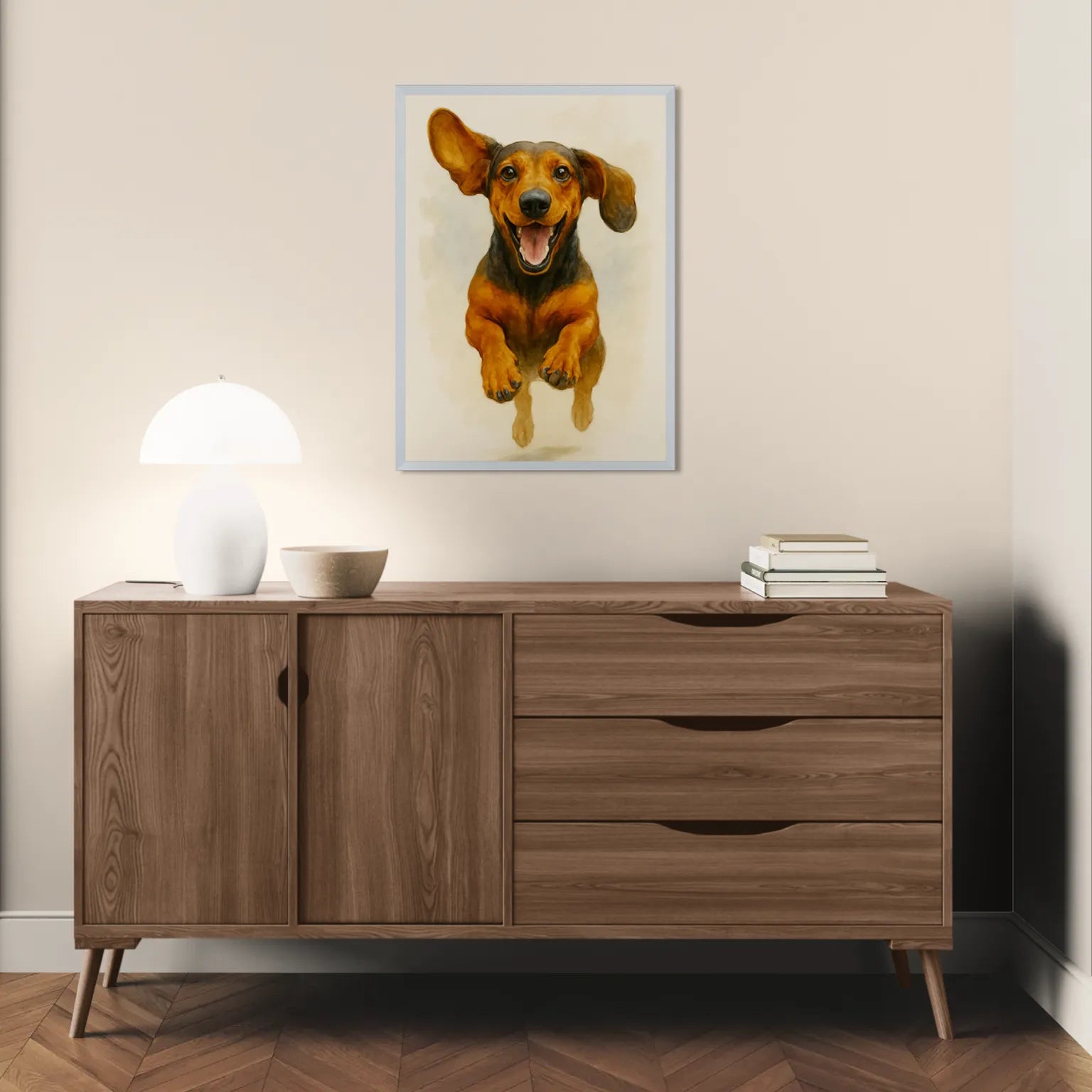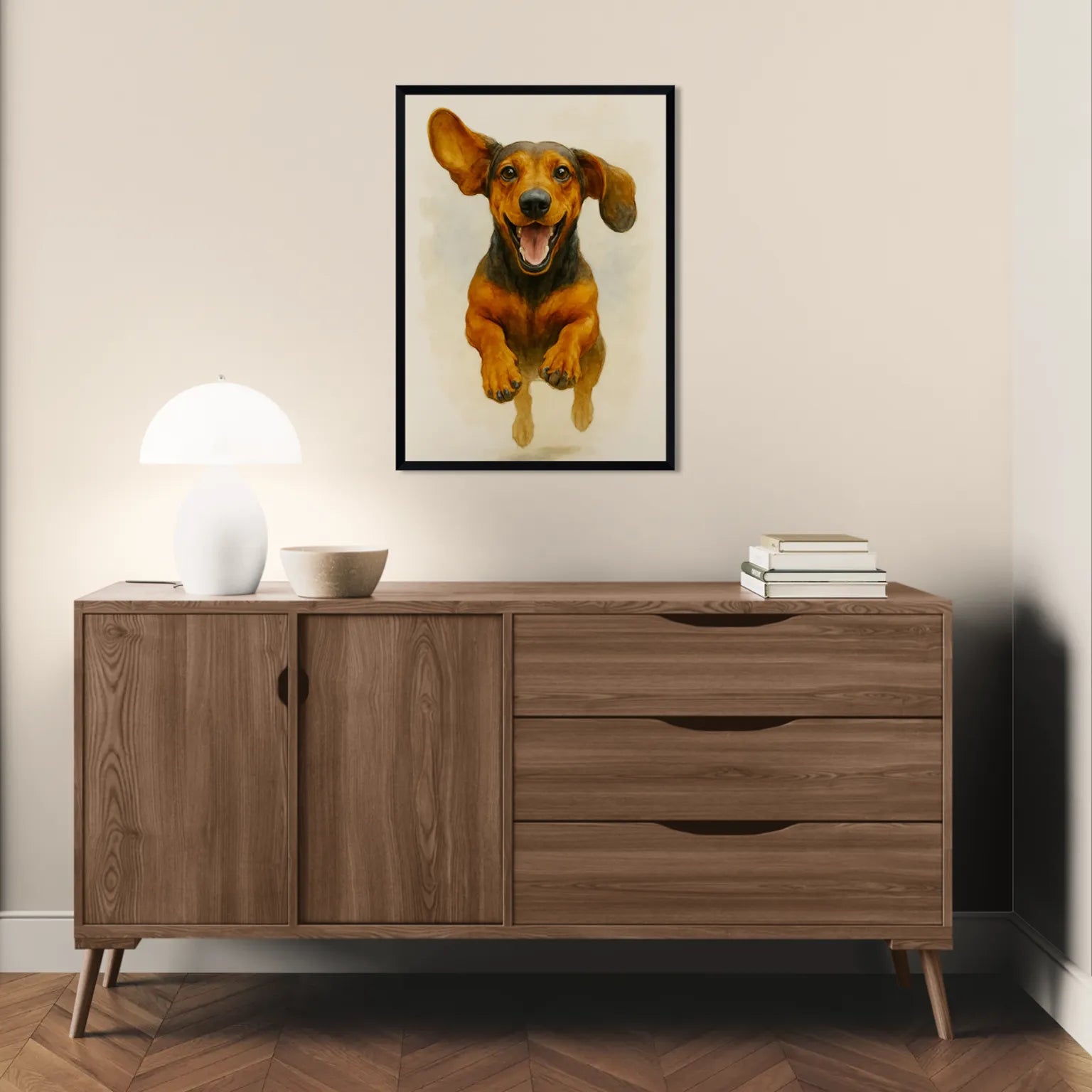 Un dolcissimo bassotto corre verso di te con le orecchie al vento, dipinto in stile acquerello realistico. L’effetto è poetico e tenero, con colori caldi e pennellate leggere che donano profondità e vitalità al soggetto.