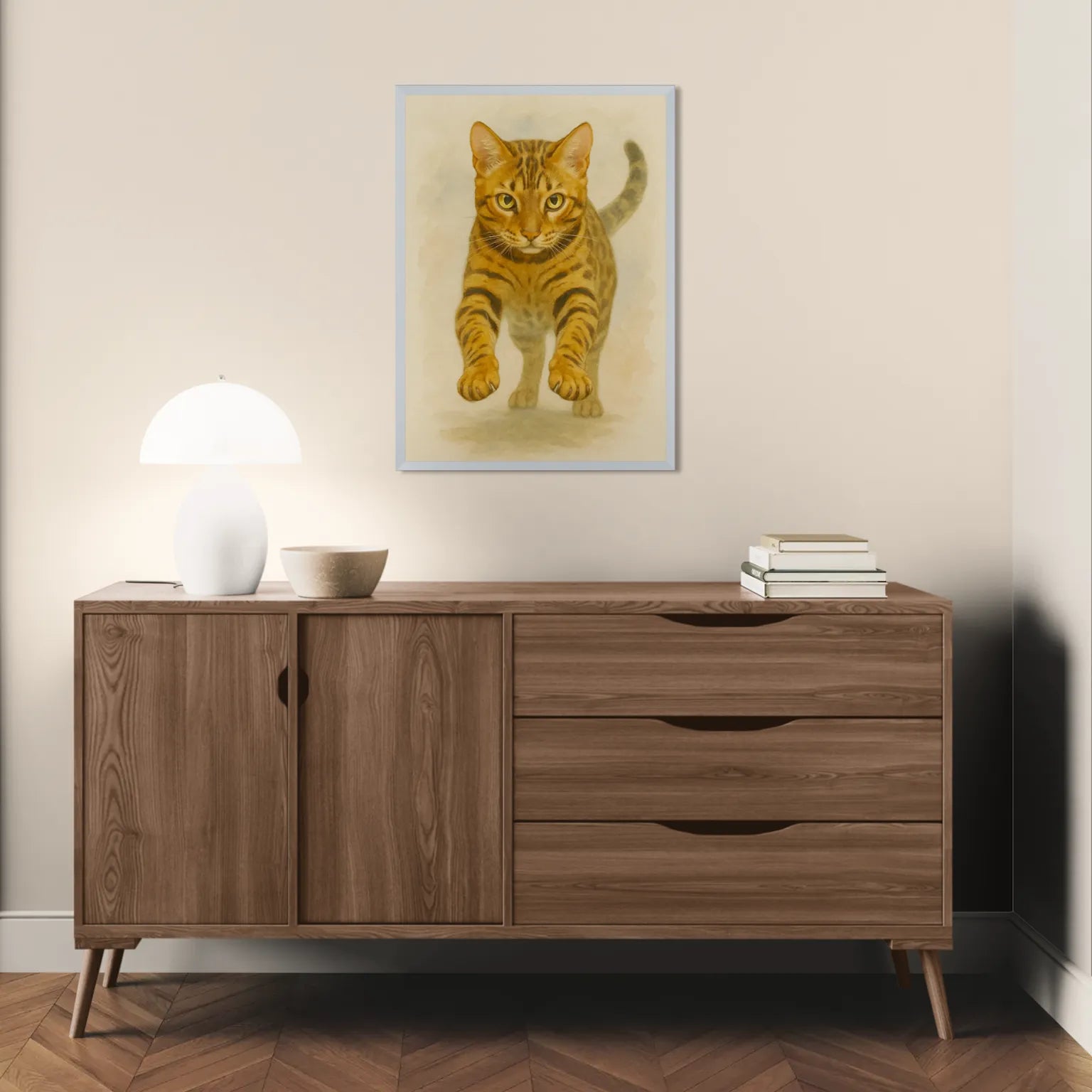 Un elegante gatto Bengala dipinto ad acquerello si muove deciso verso l’osservatore, con lo sguardo attento e la tipica pelliccia maculata ben definita. L’opera è dolce ma vibrante, grazie a toni caldi e a una resa pittorica realistica.
