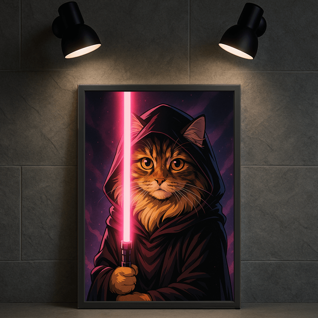 Ogni opera è stampata su Forex ecologico, un materiale rigido, leggero e riciclabile, ideale per esaltare la brillantezza della spada laser e i contrasti luminosi. Rifinita con cornice in legno certificato FSC, per un equilibrio perfetto tra magia visiva e sostenibilità.