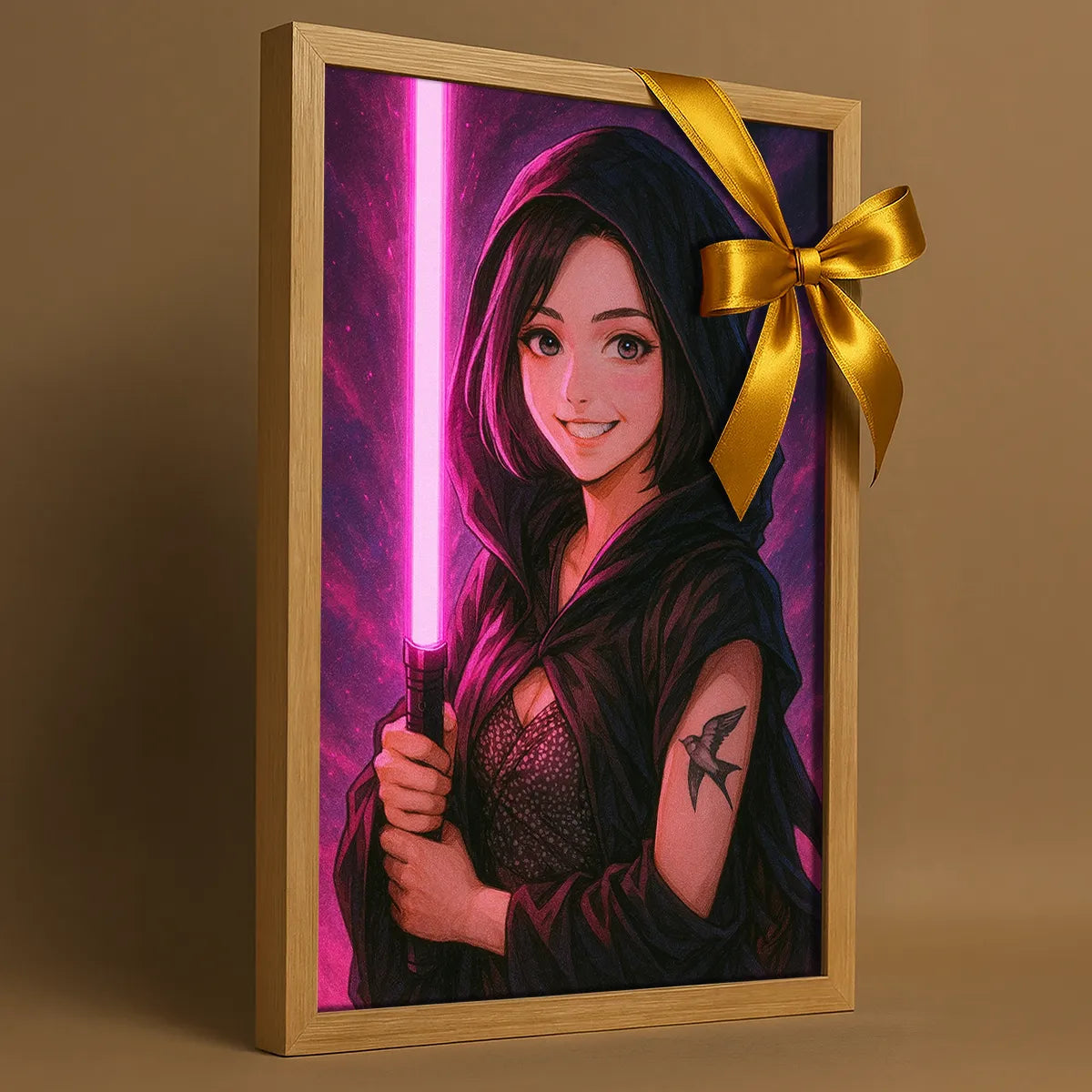 Immagina il tuo amico pelosetto (o il tuo volto) trasformato in un cavaliere galattico unico: sguardo fiero, spada luminosa rosa che illumina la scena e un’aura di mistero e magia. Con il nostro stile Cavaliere Rosa, ogni ritratto diventa una visione potente e incantata, ispirata ai manga fantasy e all’estetica spaziale.