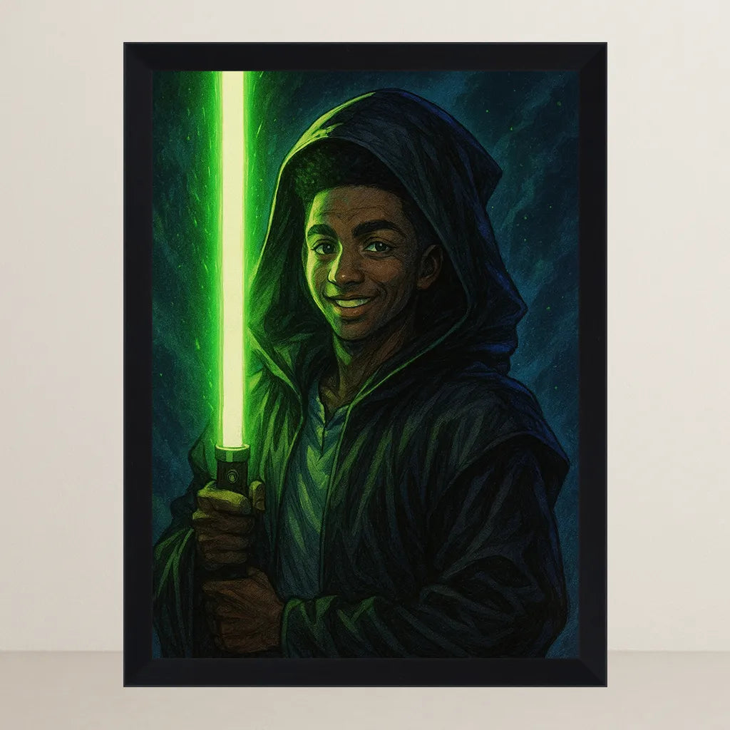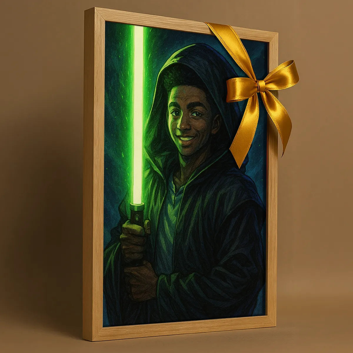 Immagina il tuo amico pelosetto (o il tuo volto) trasformato in un guerriero mistico degno delle più grandi saghe spaziali: occhi illuminati dalla luce di una spada luminosa verde, un mantello che ondeggia nel vuoto e un’aura silenziosa ma imponente. Con il nostro stile Cavaliere Verde, ogni ritratto diventa un’illustrazione leggendaria.