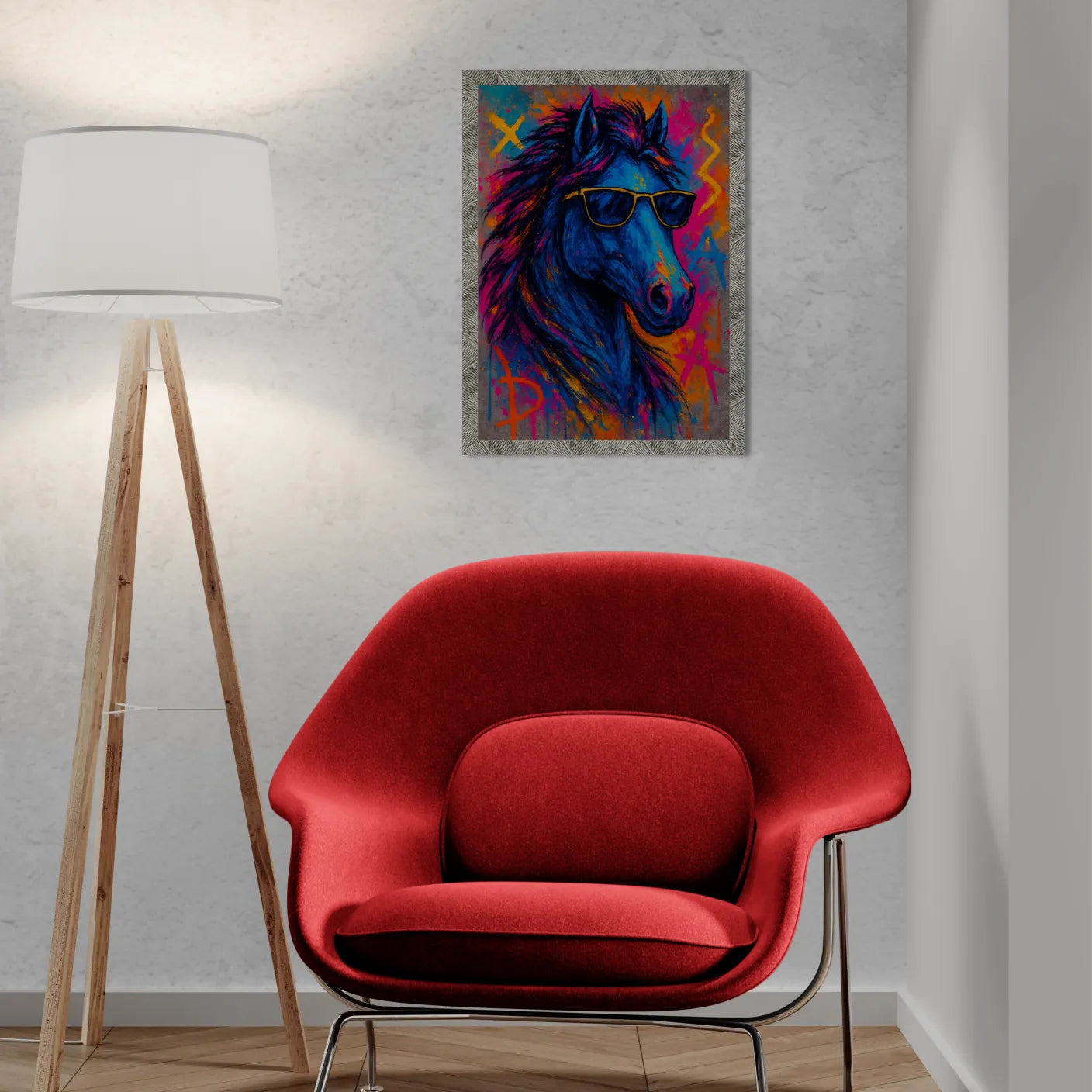 Porta energia e libertà nelle tue stanze con questa stampa street art dal carattere grintoso. Il protagonista è un cavallo stilizzato con occhiali da sole, criniera al vento e sguardo deciso, realizzato con colori fluo e tratti ribelli. Una combinazione perfetta tra forza, eleganza e spirito rock.