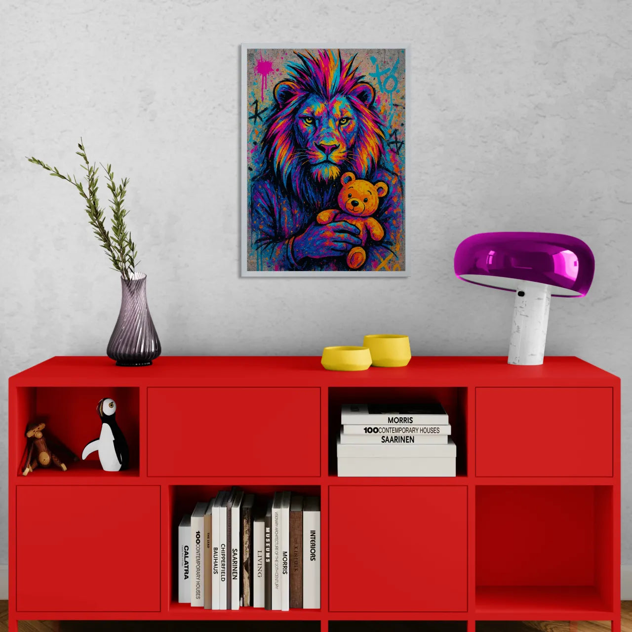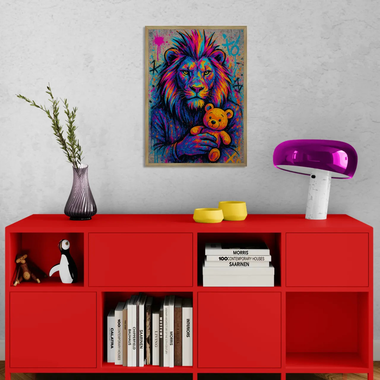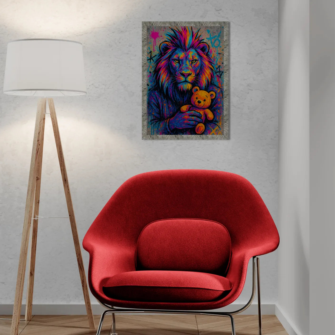 Rendi unico il tuo spazio con questa stampa artistica che fonde la forza regale del leone alla dolcezza di un tenero orsacchiotto. Un’opera in stile street art colorato che unisce sguardo fiero e pennellate vivaci, trasmettendo un messaggio di forza e sensibilità insieme.