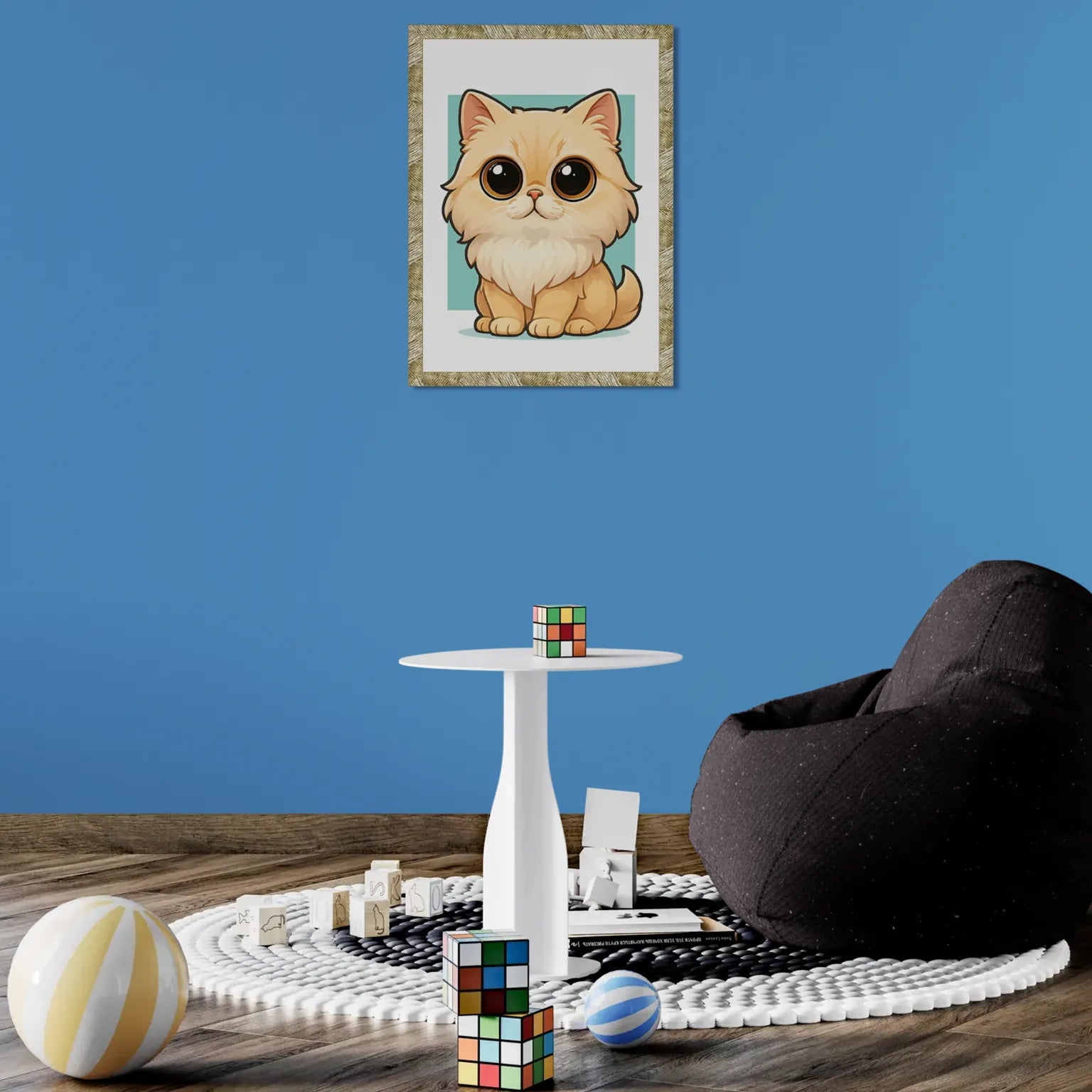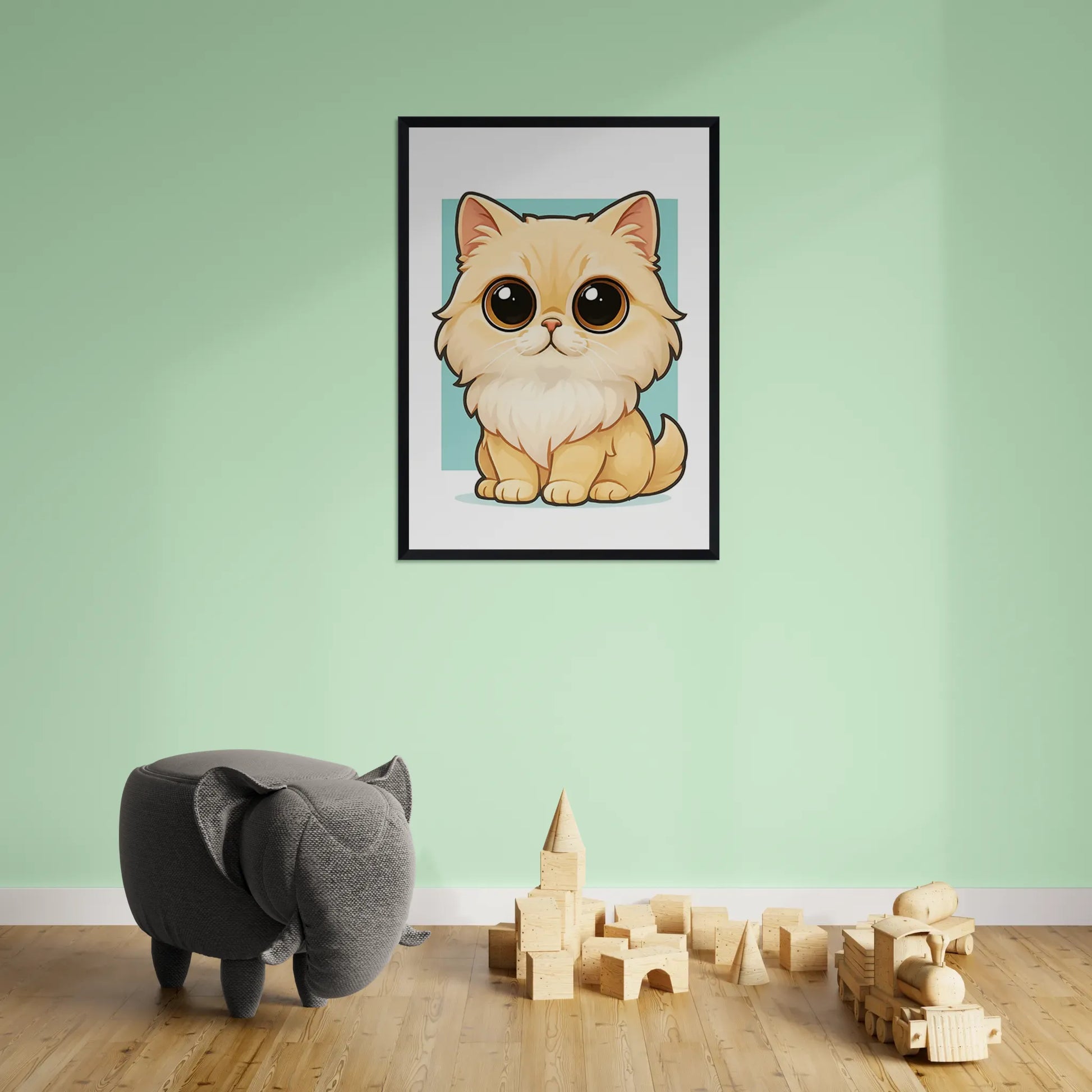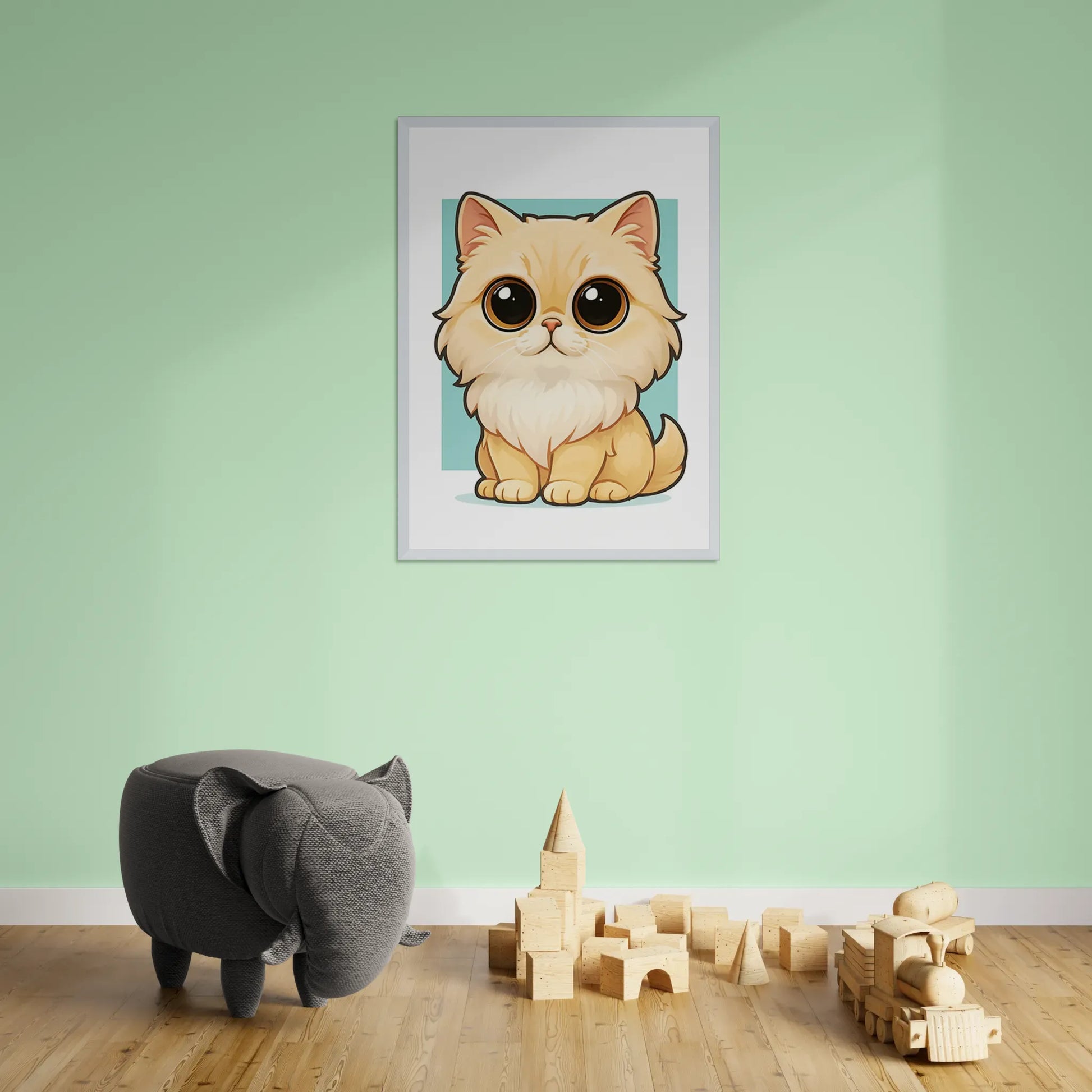 Dona un tocco di eleganza e tenerezza ai tuoi ambienti con questo dolcissimo ritratto di gatto Persiano in stile Chibi. Con occhi grandi, pelo vaporoso e un’espressione buffa, questa illustrazione conquista al primo sguardo.