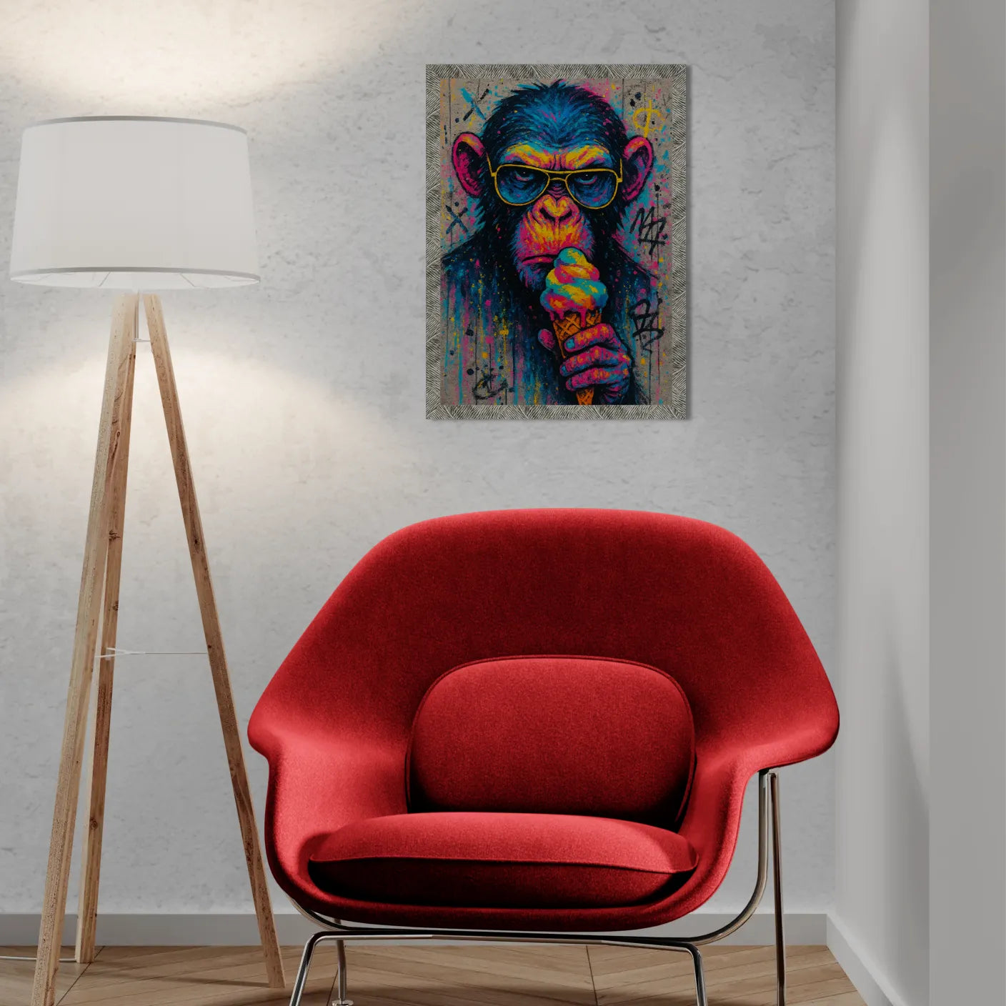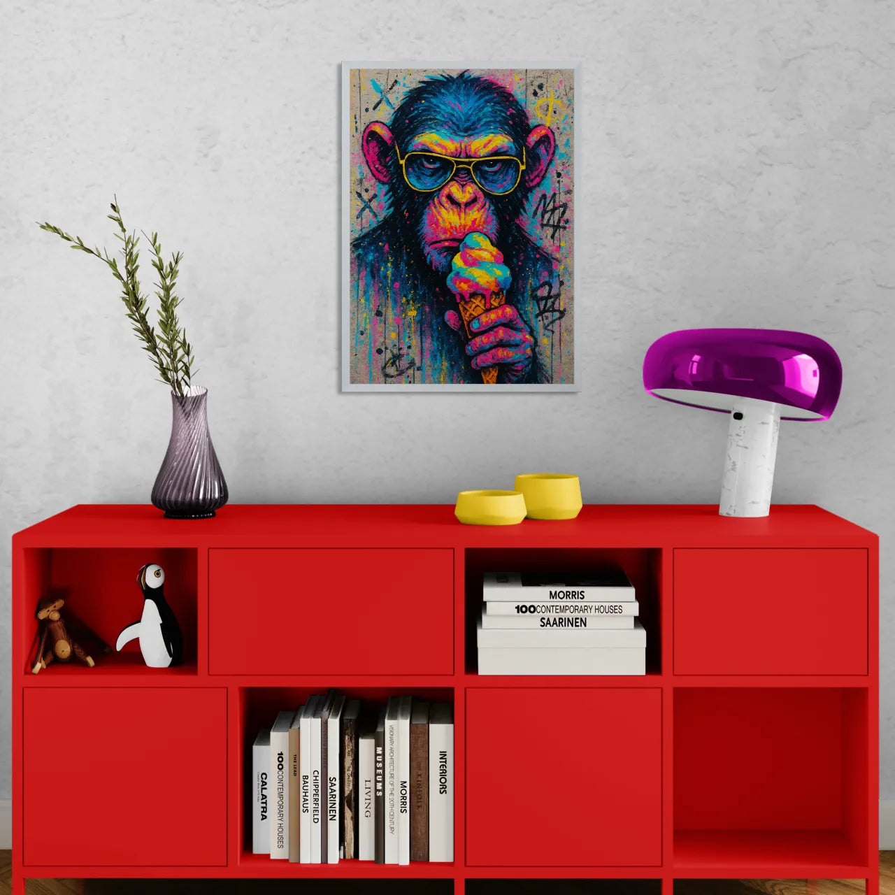 Aggiungi un tocco di ironia e stile urban ai tuoi ambienti con questa vivace stampa pop street art. La protagonista? Una scimmia ribelle con occhiali da sole e sguardo deciso, che gusta un gelato fluo in perfetto stile metropolitano.