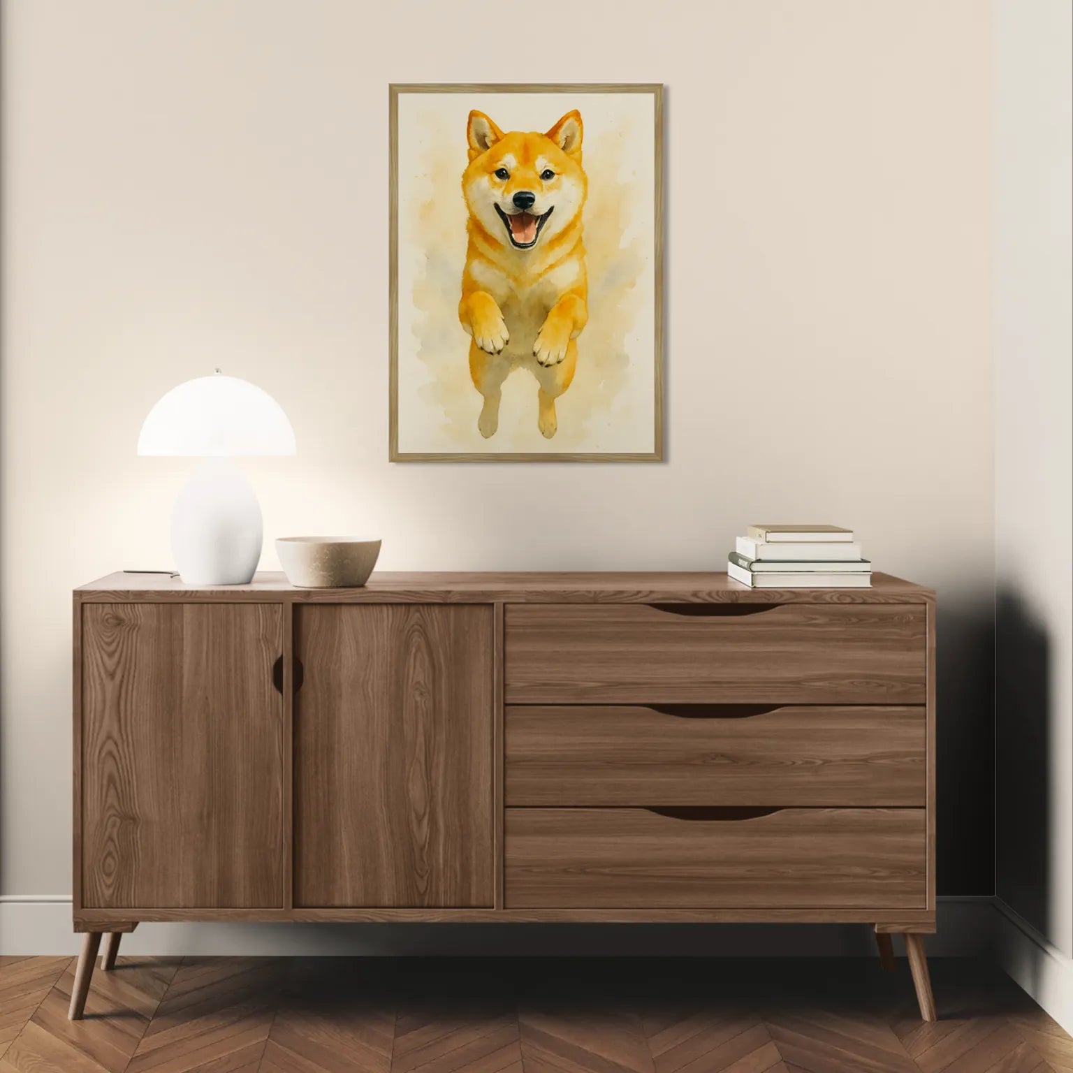Lo sguardo fiero e il musetto furbo del Shiba Inu conquistano in questa delicata illustrazione ad acquerello. La posa dinamica e i toni caldi lo rendono perfetto per portare un tocco di Giappone e simpatia nelle tue pareti.